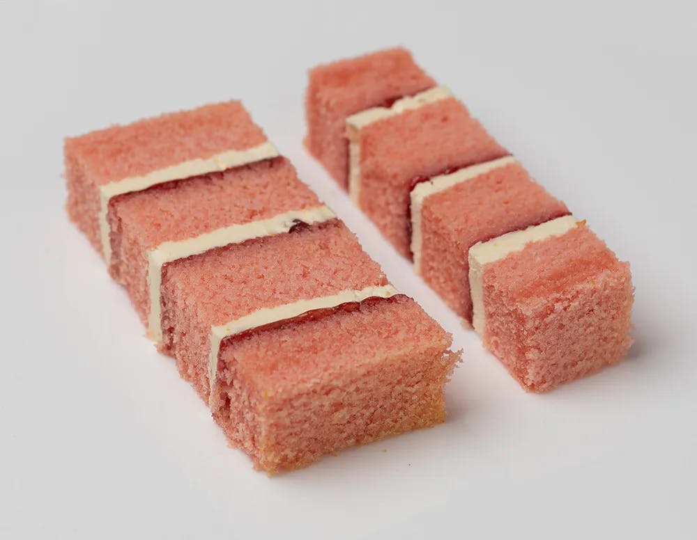 Pink champagne sponge, filled with alternating layers of champagne buttercream and strawberry preserve.