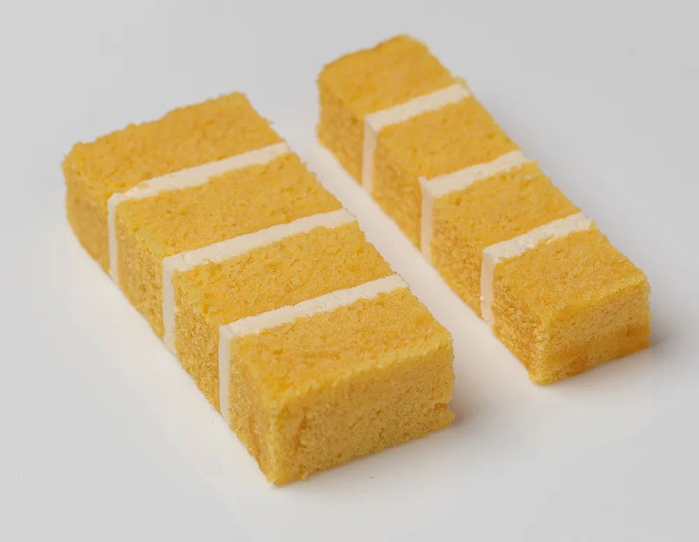 French Vanilla white sponge, filled with layers of vanilla buttercream and your choice of raspberry or strawberry preserves.